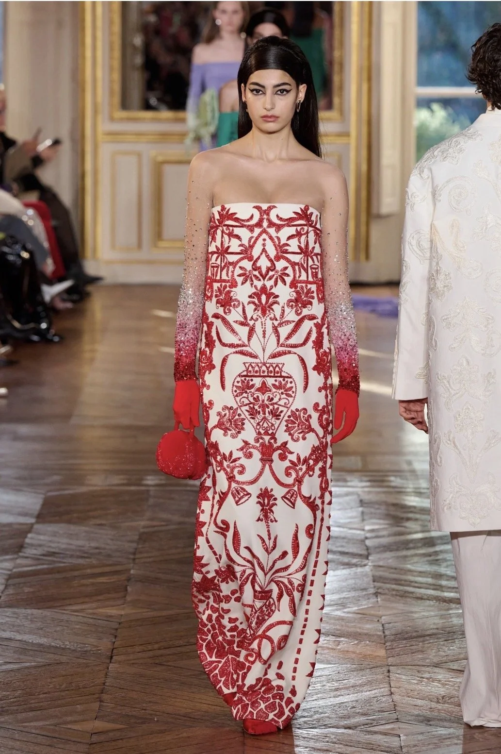 There is a juxtaposition of sensuality and modesty as we see the silhouette is frequently enhanced, showing the curves of the body but hands remained covered during the show, the gloves became a significant design element. In Arab culture, the notion of modesty plays a significant role in social norms and values. Arab societies often place a high value on modesty, which is influenced by Islamic teachings as well as cultural traditions. The revealing of the curves and the chest and the concealing of the hands has a nod to both western and traditional style.