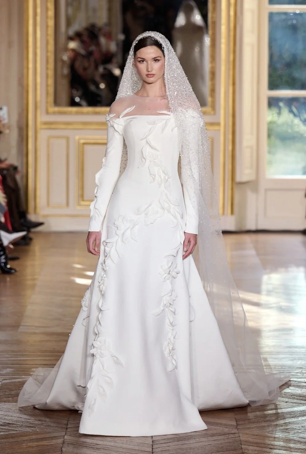 Model, Angelina Frerk, closes the show in a bridal gown featuring a form-fitting silhouettes adorned with intricate 3D floral embellishments. The crepe dress boasts an elegant off-the-shoulder neckline. The look is accessorised with a stunning embellished veiled with crystals gracefully falling at the edge of the headscarf. This look is beautifully demonstrate modesty and elegance that we continued to see throughout the show.