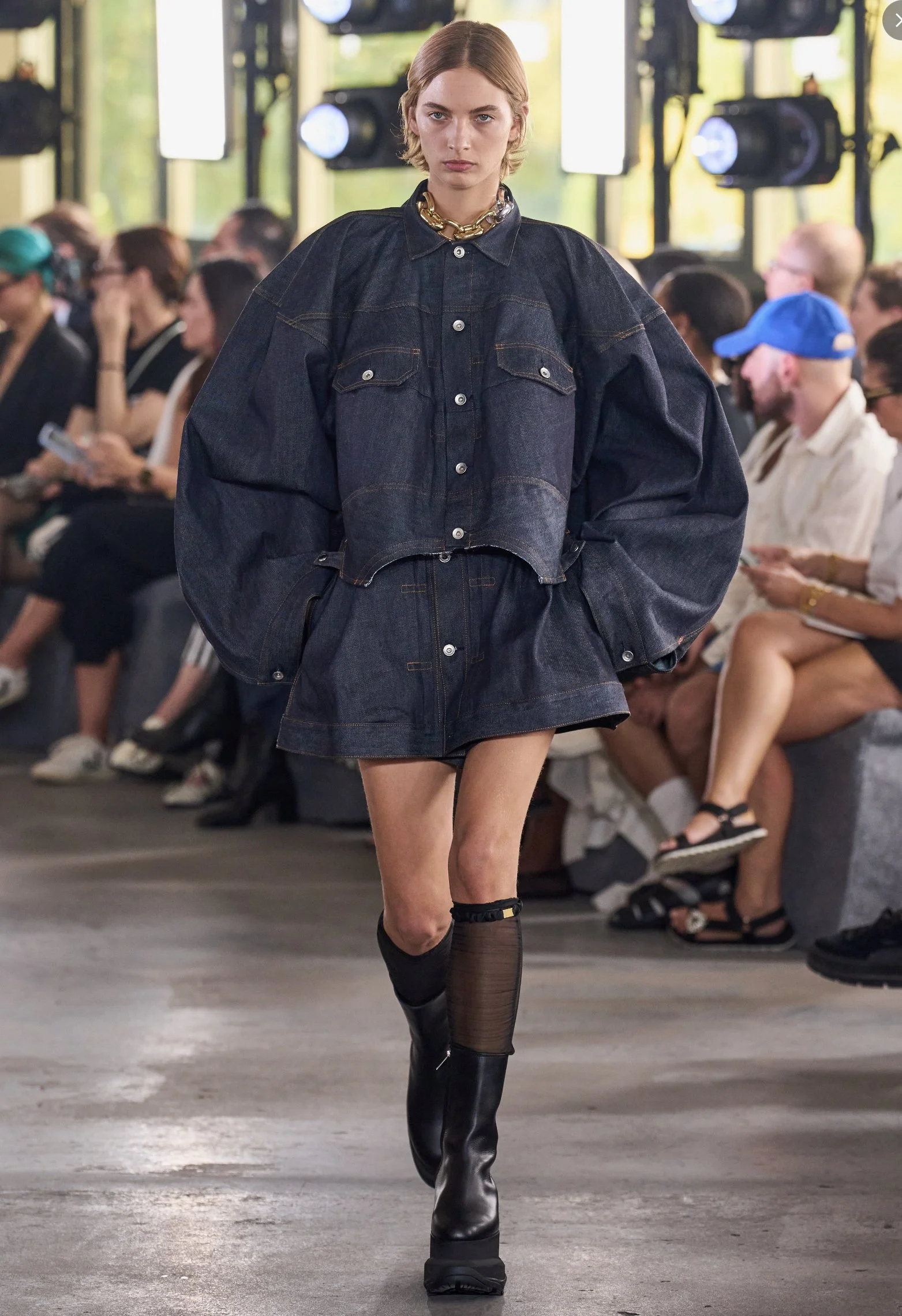 Look 13 featured a cropped denim jacket in a deep wash, showcasing a timeless collar and balloon sleeves. This was complemented by high-waisted voluminous shorts in a matching dark wash. The enduring popularity of the double denim trend remains evident.